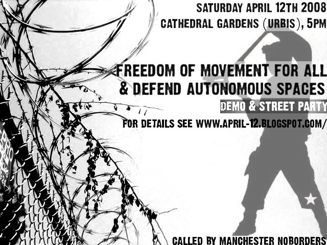 This Saturday (12th of April), from 5pm, there will be a demonstration and street party held in Manchester city centre in defence of autonomous spaces and for freedom of movement. Support would be much appreciated. The event takes place as part of an international day of action (www.april12.squat.net).