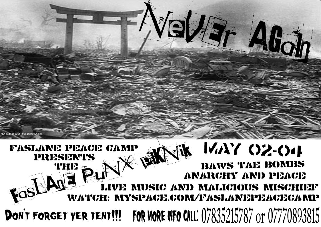 With Benefit gigs up an down the country to help fund this event,Faslane Peace camp invites you all to join us to party + protest- Help kick off a summer of rebellion!!
